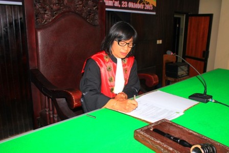 Ketua Pengadilan Negeri Sumbawa Besar, Ibu Sri Sulastri, S.H., M.H. , memimpin acara pengambilan sumpah jabatan dan pelantikan Panitera Muda Hukum Sdr. Saifullah,S.H. di Ruang Sidang Utama Pengadilan Negeri Sumbawa Besar, pada hari Jum’at tanggal 23 Oktober 2015 jam 08.00 Wita. Acara pengambilan sumpah jabatan dan pelantikan tersebut diikuti oleh Wakil Ketua, Hakim, Panitera Sekretaris dan seluruh pegawai Pengadilan Negeri Sumbawa Besar yang berlangsung dengan khidmat.